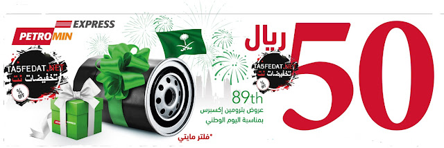 عروض رهيبة من بترومين Petromin السعودية بمناسبة العيد الوطني السعودي 89 على تغيير الزيت والفلتر :