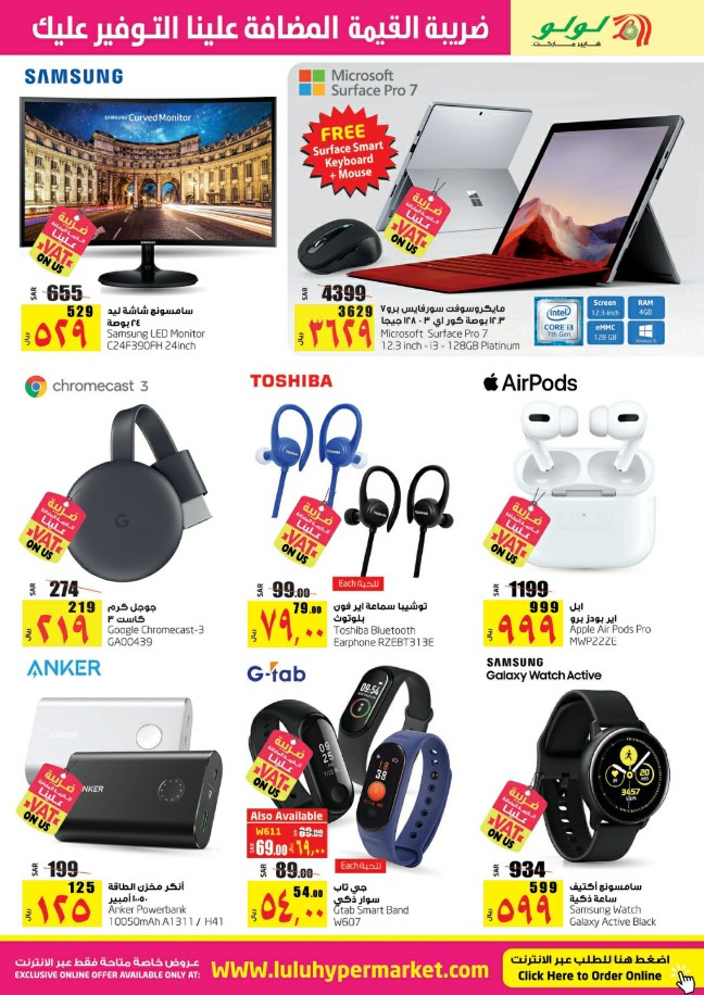 تسوقوا من عروض لولو Lulu ماركت ضريبة القيمة المضافة علينا على المواد الغذائية والاستهلاكية والاجهزة والالكترونيات ومستلزمات المنزل وحقائب السفر .